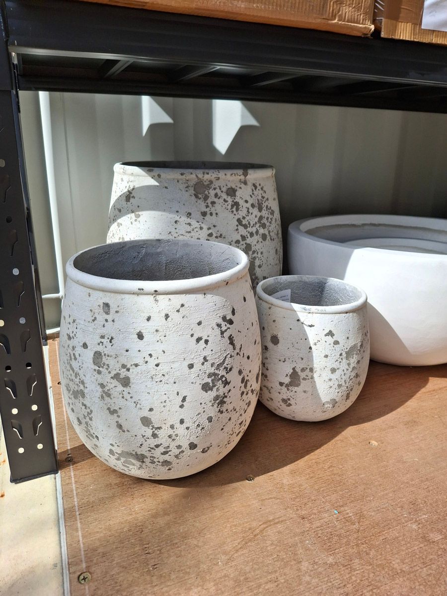 Featured here is our speckled finish in a variety of sizes, as well as larger round statement planters—up to 67 × 55cm.