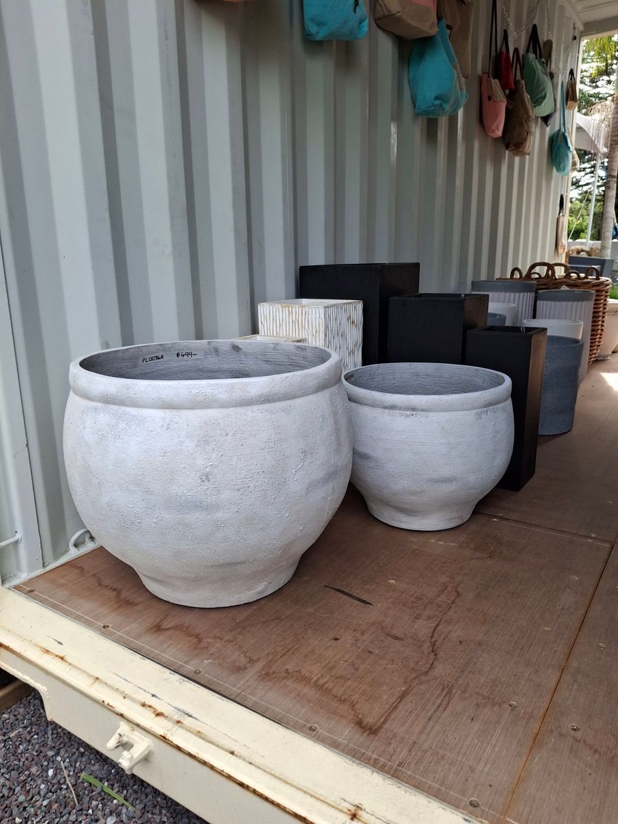 A selection of fibre cement pots and planters now available at Ella’s Barn in Kerikeri.